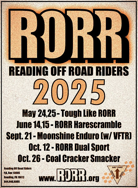 We operate 3 events yearly. Enduro, Hare Scramble and a Dual Sport. Our membership has grown steadily over the past few years and our success is because of volunteers like yourselves. Our pride has shown itself to our participants. Our courses may not be the easiest to traverse, which makes our jobs even harder. The hard work from our members is justly rewarded by not only putting on a quality professional event, but by clubs social events held at various times throughout the year. We meet often to just ride, we help our land-owners and boroughs by doing cleanup duties, and have 2 annual RORR parties. So come out an join the club and have some fun!